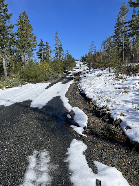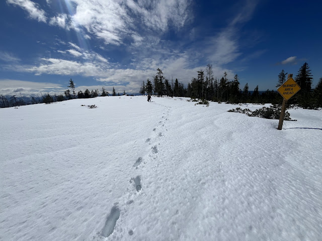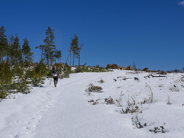 If I had known what was waiting for us up there, I might have reconsidered doing the trip. The snow was deep, deep enough that we were postholing and did not reach the gravel of the road with our feet, in placed when I wasn't careful or the snow was particularly soft I'd sink below my knee. It was of an awful consistency, where it would nearly support our weight, but as soon as we lifted the second foot we would break through the surface and sink. This lasted for 2 miles and was genuinely challenging.